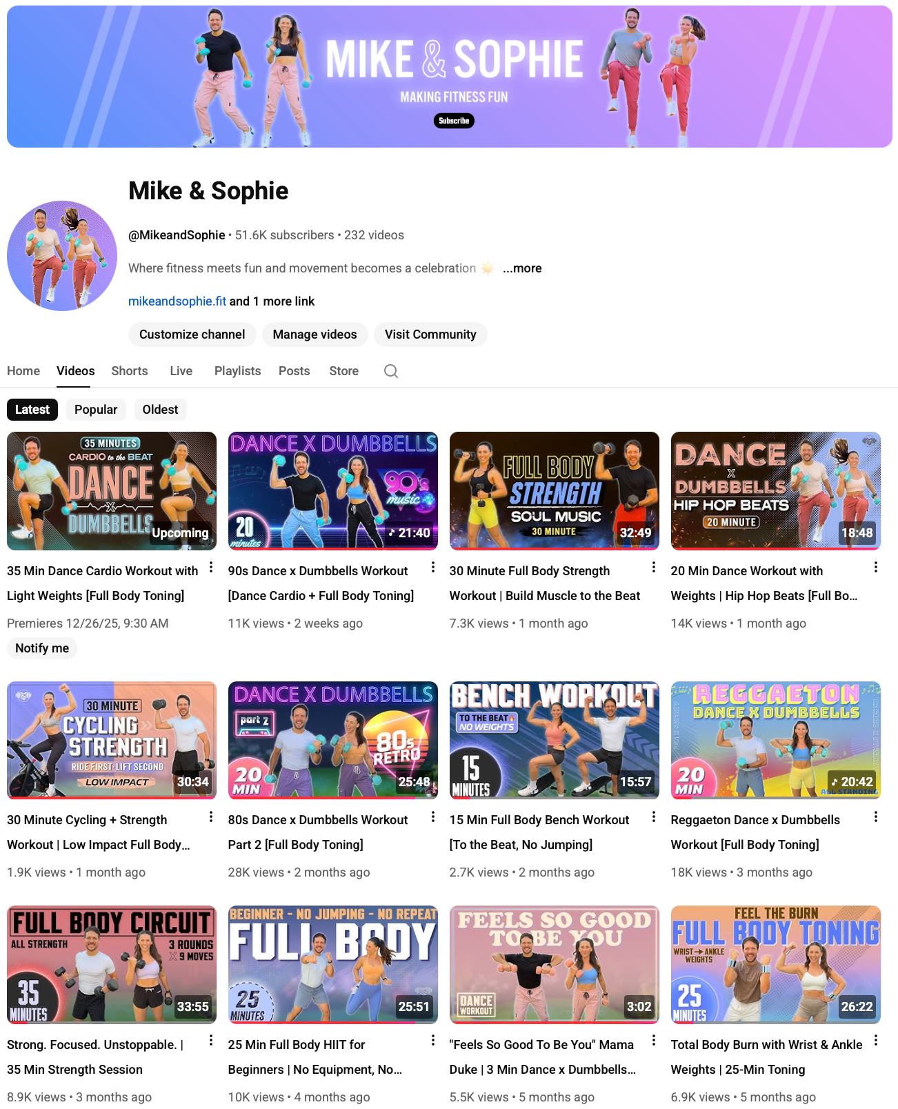 Mike & Sophie is a fitness-focused YouTube channel co-created and operated with my wife, built around the mission of making workouts fun, approachable, and engaging for a broad audience. I oversee the full creative and production process for the brand, managing all visual and editorial execution end to end.